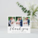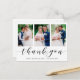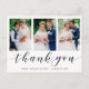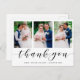 Send a custom modern photo collage thank you card to your family and friends to thank them for attending your wedding. This elegant design template features three of your wedding photos framed in white. Below in black calligraphy script it reads, "Thank You" with your name and date for you to personalise. The back of the card has a message and signature accented by a sprig of watercolor eucalyptus greenery. This was a joy to create for you. Congrats on your marriage! Designed by artist ©Susan Coffey.