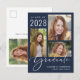 Modern and simple dark blue graduation announcement postcard featuring a 3 picture photo collage and "Graduate" in a stylish white script on the front. Add the grad's name, class year and school or university. On the reverse side, add an additional picture and your custom message, with space for a handwritten note if desired.