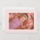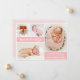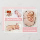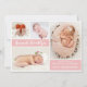 Modern, Pink 4 Photo Collage Baby Birth Announcement Cards. Elegant, cute 2-sided photo birth announcement template card featuring four (4) of your favourite baby photos on front, with a pretty hand lettered script in white on soft pink colour blocks. Add your baby's name on the front and birth stats. On the back side there's one horizontal baby photo on blush pink white dotted background. You can easily personalise it.