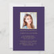 This modern graduation announcement card with custom 4 photo collage will be the perfect choice to send to your family and friends. The front of the card has three photos for you to change to your own bordered in purple. Below in modern faux gold script it reads "Graduate" with class year, name and school to personalise. The back of the card has a 4th photo with more details about your graduation and future plans to customise. Congrats on your graduation! Designed by Susan Coffey.