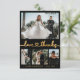 Modern, Elegant "Love and thanks" Gold Script 4 Photo Collage Black Wedding Thank You Card. Minimalist, stylish wedding card template featuring four (4) grid photo collage on the front and one (1) photo on the reverse side. "Love and thanks" text in a hand lettered calligraphy cute heart swash tail font script in gold on black background. Personalise with your name and thank you message. If You need help or matching item, please contact to designer!