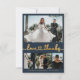Modern, Elegant "Love and thanks" Gold Script 4 Photo Collage Navy Wedding Thank You Card. Minimalist, stylish wedding card template featuring four (4) grid photo collage on the front and one (1) photo on the reverse side. "Love and thanks" text in a hand lettered calligraphy cute heart swash tail font script in gold on navy blue background. Personalise with your name and thank you message. If You need help or matching item, please contact to designer!