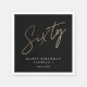 Modern 60th birthday simple stylish elegant party napkin features stylish faux gold foil number handwritten script Sixty and your party details in classic serif font on black background color, simple and elegant, great surprise adult milestone party decor for men and women. The black background color can be changed to any color of your choice.