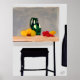Poster in a modern, Boho style abstract of a tabletop and atool, with a still life arrangement of pitcher and fruit, in shades of soft grey, black and beige, accented with red and golden yellow