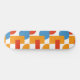 Modern art piece of geometric shapes. Made up of circles and rectangles in blue, orange and red on a white background.