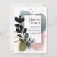 Set an artistic and contemporary tone for your celebration with this modern abstract wedding invitation. The design is a dynamic composition set against a clean white background. The foundation is a series of soft, layered watercolor washes in a unique colour palette: muted blush pink, dusty sage green, deep teal-grey, and a hint of light grey, creating an organic, painterly backdrop. A sleek, thin dark grey rectangular frame sits centrally, providing a crisp, modern boundary for your text. This geometric element is beautifully contrasted by bold, stylised black leaves and dark botanical elements that artfully break the frame. Accents include delicate coral berries, subtle dark splatters, and touches of faded rust-brown branches, adding depth and organic texture. This bohemian, modern style is perfect for couples planning an urban museum wedding, a contemporary gallery reception, or any event emphasising unconventional, artistic elegance and a unique colour palette. This design is perfect for modern wedding invitations, abstract art engagement party announcements, boho chic event invites, or sophisticated cocktail party stationery. This distinct graphic is also an incredible choice for a high-end interior design studio announcement or a creative brand's exclusive product launch.