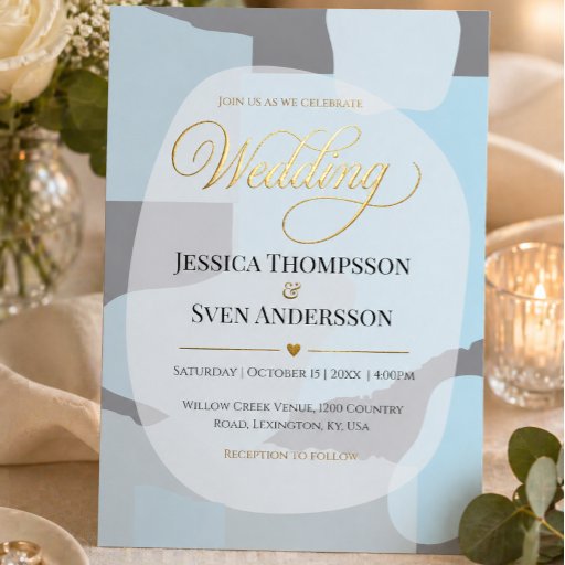 Announce your special day with this modern abstract blue wedding invitation, designed in a minimalist watercolor style. Soft ivory and calming blue shapes create an artistic geometric background, while a subtle translucent overlay highlights your wedding details with clarity and elegance. Perfect for couples who love contemporary design, Scandinavian aesthetics, or a clean and sophisticated look, this invitation is ideal for city weddings, modern venues, beach ceremonies, or destination celebrations. The minimalist design allows your names and wedding details to take centre stage, making it timeless and versatile. Customise easily with your own text and create a unique keepsake that reflects your personal style. A chic alternative to floral invitations, this design is perfect for those seeking a trendy, artistic, and minimalist wedding stationery suite.
