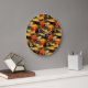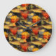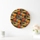 A modern contemporary clock abstract art pattern with rustic calico coloured square paint splotches and gold coloured roman numerals.