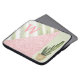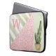 A coral monogram is featured against a modern abstract pattern divided in triangular shapes. The design features colours of coral, a faux pink glitter, and a sage green background with a cactus in a pot. Add your monogram to customise this computer sleeve. Other colours and patterns are available.