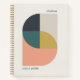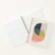 A minimalist modern abstract art journal notebook with an elegant geometric design in muted colours of coral pink, mustard gold yellow, teal green, navy blue and natural soft taupe grey. The perfect accessory for a minimal contemporary home office.
