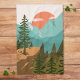 Introducing our Modern Abstract Forest, Mountains, and Sunrise kitchen towel. Featuring landscape illustration in vintage style. Suitable for as a gift for nature and cooking enthusiasts.