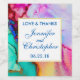 Love & Thanks wedding bottle label with a fancy artistic abstract design. Watercolor painting with the colours mixing and mingling creating a nice flowing marbled pattern. A white frame with a faux gold foil border layered over top with your personalised text written inside.