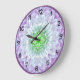 Unique kitchen wall decor clock designed with a beautiful purple and green mandala style background as an abstract floral design. Makes a great kitchen, bedroom, or bathroom wall clock.