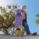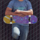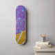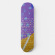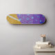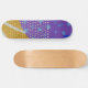 Modern skateboard done in an abstract graphic design, in purple and golden yellow, with blue large, distressed glitter dots and white small dots. Customise to add any text you want.