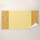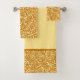 Towel set in a semi-abstract, all over pattern of roses and buds - mixed media digital art in in deep mustard gold / yellow and soft butter yellow, with a faux ribbon trim on the bath towel