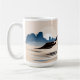This mug features a modern, abstract desert landscape design, with sweeping lines and layered colours resembling a sunset or dune scene, framed by distant mountains. The colour palette includes soft shades of beige, cream, navy, and black, creating a warm and serene atmosphere. The central design prominently displays a customisable monogram in the middle, enclosed in a simple square frame.