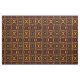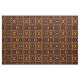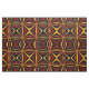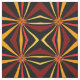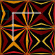 This contemporary fabric design features a repeating modern abstract geometric pattern of the sun and it's rays in colours of red, yellow, gold, orange and brown on a black background.