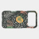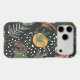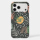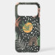 A sophisticated and trendy surface design that blends organic and geometric elements for a contemporary aesthetic. This seamless pattern features bold abstract shapes, including stylized tropical leaves in white line art and solid green/orange fills, set against a dark background with terrazzo-style white flecks. Modern rainbow motifs and organic circles in muted teal, pink, and mustard yellow complete the look.