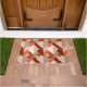 Doormat in a Mid-Century Modern design of layered triangles in shades of brown, taupe, beige, rust and camel, accented with mandarin orange