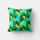 Throw pillow in a Mid-Century Modern design of layered triangles in shades of deep emerald green, lime, aqua, teal, and turquoise