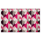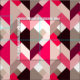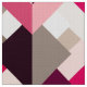 Fabric in a Mid-Century Modern design of layered triangles in shades of fuchsia pink, light pink, and stone grey / grey, accented with white