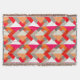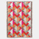 Throw in a Mid-Century Modern design of layered triangles in shades of orange, fuchsia pink, tomato red, peach, and stone grey / grey, accented with white