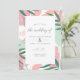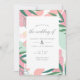 A modern wedding invitation featuring leaves and abstract shapes in teal, neo mint, and forest green, and millennial pink and coral, with text in grey. Your wedding details are in grey font, with the "The wedding of' in modern calligraphy font as the headline. The reverse is in solid teal green.