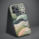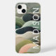 Modern Abstract Wavy Pattern Personalised Name iPhone 14 Plus Smart Phone Cases features an abstract wavy pattern in grey, green and pink with your personalised name in white modern script typography. Perfect for personalised Christmas gifts and winter holidays. Designed by © Evco Studio www.zazzle.com/store/evcostudio