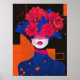 Surreal digital portrait wall art, avant-garde woman illustration, geometric face surrealism, bold floral fashion artwork, modern abstract print in red and teal.