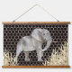 Modern African elephant hanging tapestry. Beautiful watercolor of an African elephant walking amongst foliage. Black and gold style pattern in the background gives it a modern touch.