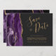 This elegant modern save the date card features a purple watercolor agate border trimmed with faux gold glitter. The customizable text combines gold colored handwriting script, copperplate and italic fonts on a dark charcoal gray background. The reverse side features a matching purple and gold agate design.