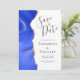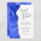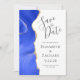This elegant modern save the date card features a royal blue watercolor agate border trimmed with faux gold glitter. The customisable text is charcoal grey on a white background. The reverse side features a matching royal blue and gold agate design.