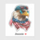 On this fun contour sticker is the image of a fierce American bald eagle. The eagle wears sunglasses and a blue hat, and has an American flag scarf around his neck. Unique and bright!