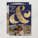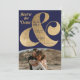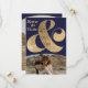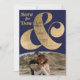 Modern and Elegant script calligraphy ampersand with rounded mask overlay of simple 2 photos in faux gold foil and navy blue wedding save the date.