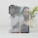 This elegant blue wedding invitation features a full bleed front photo, and beautiful white calligraphy script typography. A centre sheer blue overlay adds a modern touch.