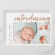 An elegant and modern birth announcement card featuring three photos (one square and two horizontal), with "introducing" in across the top in hand lettered rose gold foil brush script typography. Personalise with your baby's name and birth stats along the left side. Add a personal message to the back, along with an additional photo.