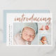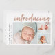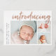 An elegant and modern birth announcement card featuring three photos (one square and two horizontal), with "introducing" in across the top in hand lettered rose gold foil brush script typography. Personalize with your baby's name and birth stats along the left side. Add a personal message to the back, along with an additional photo.