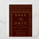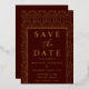 Elegant, art deco wedding save the date featuring a gold foil arch pattern with a burgundy background. Personalise the modern art deco save the dates with your names and wedding details in gold foil lettering.