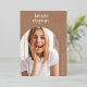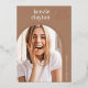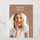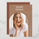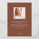 Modern photo graduation announcement features a vertical or portrait orientated photo in a unique arched layout, on a terracotta rust background accented with silver foil trim. The graduate's name and graduation year appear at the top, with the school name at the lower right. Add a personal message to the back, along with an additional photo.