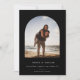 Modern arch frame, flat save the date photo card. Minimalist typography design style template with solid black colour backgrounds.