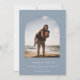 Modern arch frame, flat save the date photo card. Minimalist typography design style template with solid dusty blue colour backgrounds.