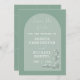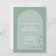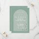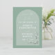 Modern Arch Green Hues Save The Date Card. Green hue shades with arch. Script and serif fonts. White flowers and white text. Back has lines of light blue. Modern and minimalistic design. Personalise with your wedding details.