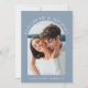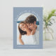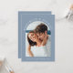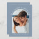 Modern dusty blue all-in-one wedding invitation that features your photo in an arch frame surrounded by your names in elegant white typography. Add your wedding date and location. On the reverse side, personalise your invitation in simple white typography and input your wedding website address to create a scannable QR code for your guests to scan to RSVP online and obtain additional wedding details such as directions and accommodations.