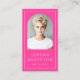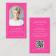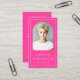 Modern, vertical, hot pink or custom colour business cards with your arch shaped photo, name and title on the front, with a thin white border along the edge of the card. Customisable template fields for your contact information, social media and QR code on the back. You can change background and font colours, move and resize elements with the design tool.