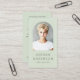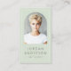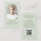 Modern, vertical, light sage green or custom colour business cards with your arch shaped photo, name and title on the front, with a thin, white border along the edge of the card. Customisable template fields for your contact information, social media and QR code on the back. You can change background and font colours, move and resize elements with the design tool.