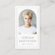 Modern, vertical, white or custom colour business cards with your arch shaped photo, name and title on the front, with a thin light grey border along the edge of the card. Customisable template fields for your contact information, social media and QR code on the back. You can change background and font colours, move and resize elements with the design tool.