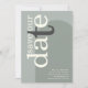 Modern Arch Stylish Typography Sage Green, A stylish typographical design in natural eathy tones to invite your family and friends to save your date, with Save Our Date in large typography rotated and to the left hand side at the top in ivory, with a grey letter "t" overlaid partially onto a darker sage arch on a background of light sage green. Easily personalise the rest of the text. Background colour can be changed on each side if you wish via Customise further.