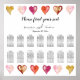 Audrey Jeanne Roberts hand painted this modern art style set of hearts in pink, magenta, red, burgundy with highlighted with metallic gold paints.  Ideal for a wedding or a Valentine's Day event with seating for up to 14 tables.  You can delete a table by simply erasing the text in its template box.  Art and design, copyright, Audrey Jeanne Roberts.