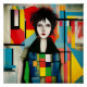 Modern design that presents a stylized illustration of a person with short, curly black hair. The person wears a colorful garment with a geometric pattern composed of bright colored squares - red, yellow, green, blue and white. The background is also very colorful and geometric, with rectangles and abstract shapes in red, yellow, blue and other bright colors. The artistic style mixes elements of cubism and pop art, with sharp lines and intense colors. The color palette is particularly striking, creating a striking contrast with the pale skin and the subject's red lips. This composition evokes the influence of Mondrian or other abstract geometric artists, but with a contemporary figurative approach. The work exudes an atmosphere that is both retro and modern.