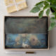 The backdrop is a mesmerising tapestry of rich blue and green hues, mirroring the mesmerising shades found in the peacock's plumage. These colours blend harmoniously, creating a sense of tranquillity and natural beauty. The peacock feathers, delicately interwoven into the composition, lend an exotic and regal touch to the artwork.